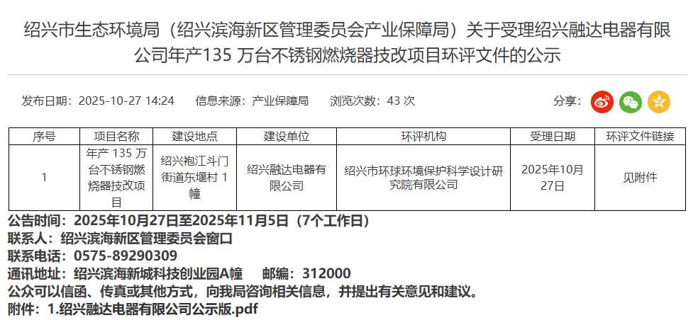 2025年10月27日,紹興市生態(tài)環(huán)境局受理紹興融達(dá)電器有限公司年產(chǎn)135萬臺(tái)不銹鋼燃燒器技改項(xiàng)目環(huán)評文件并對外進(jìn)行公示,公示時(shí)間:2025年10月27日至2025年11月5日(7個(gè)工作日)。